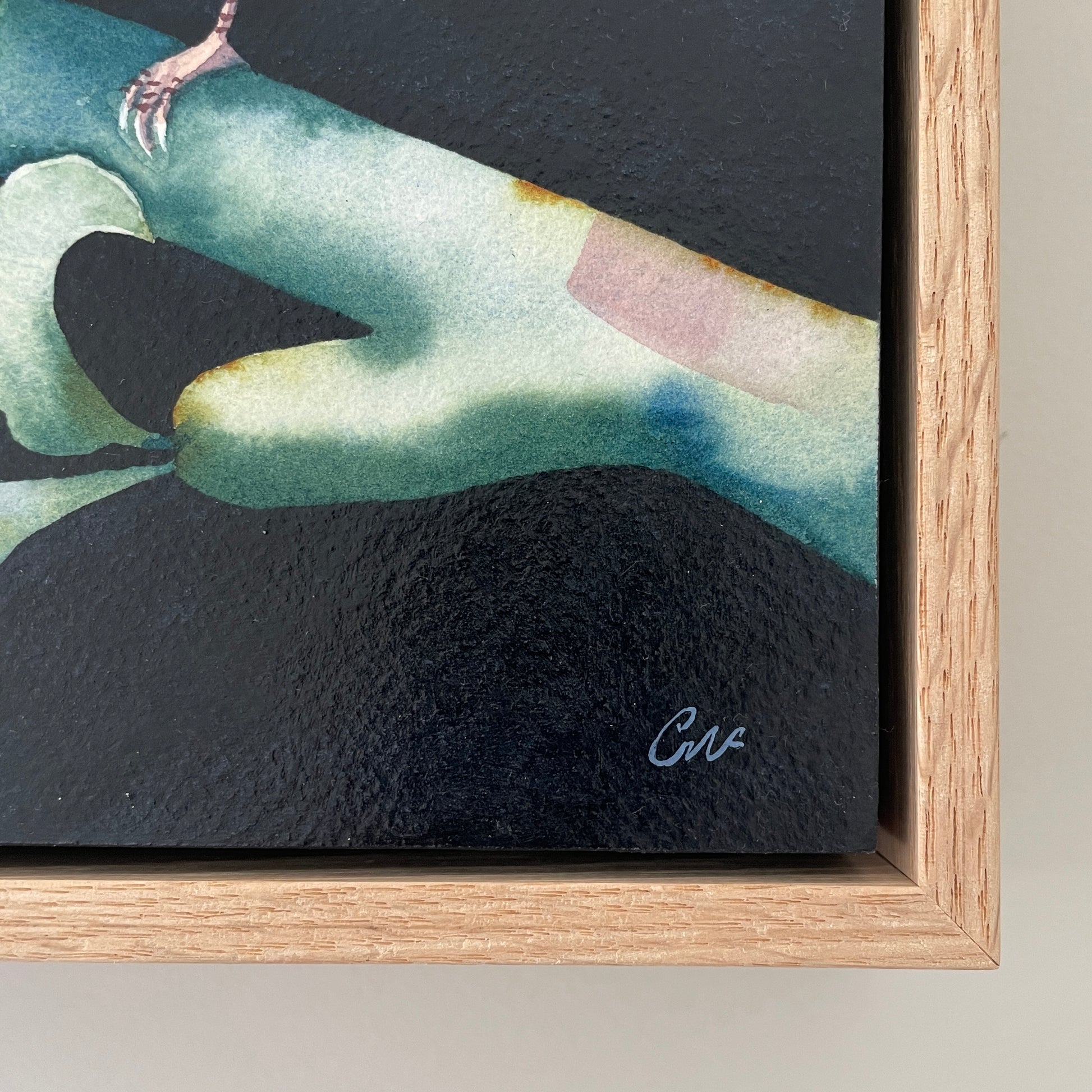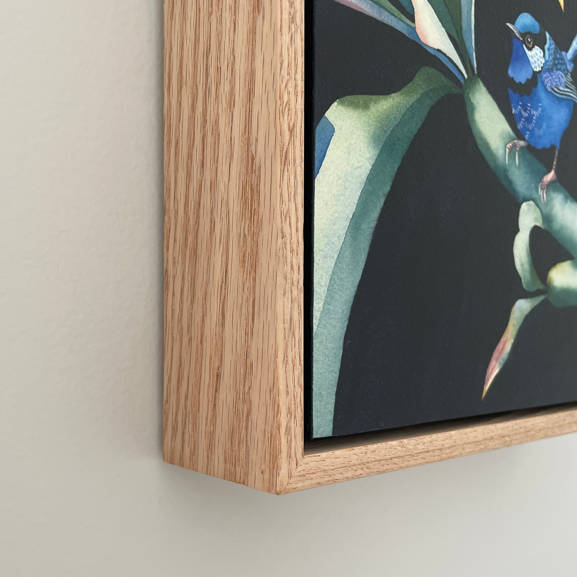 • With a raw oak timber floating frame, and D-rings and wire, it is ready to hang.
