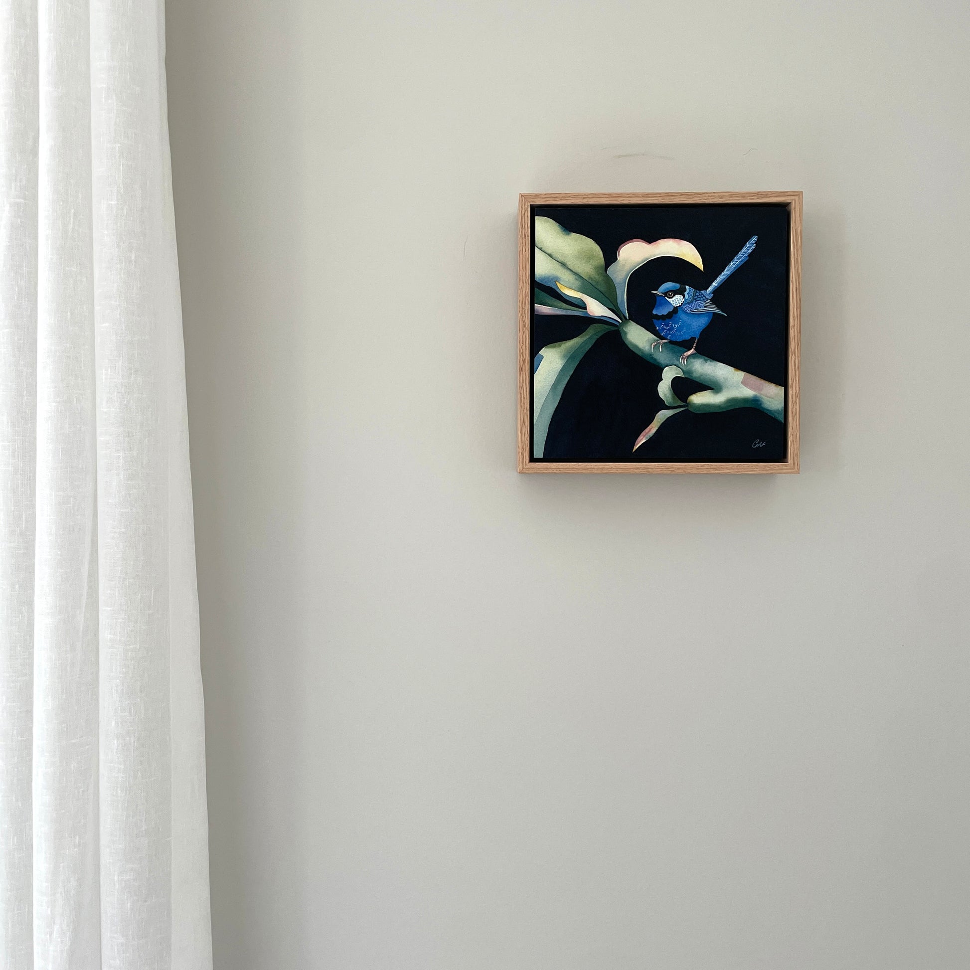 An original painting by Clare McCartney of a little Splendid Fairy Wren sitting amongst frangipani branches.