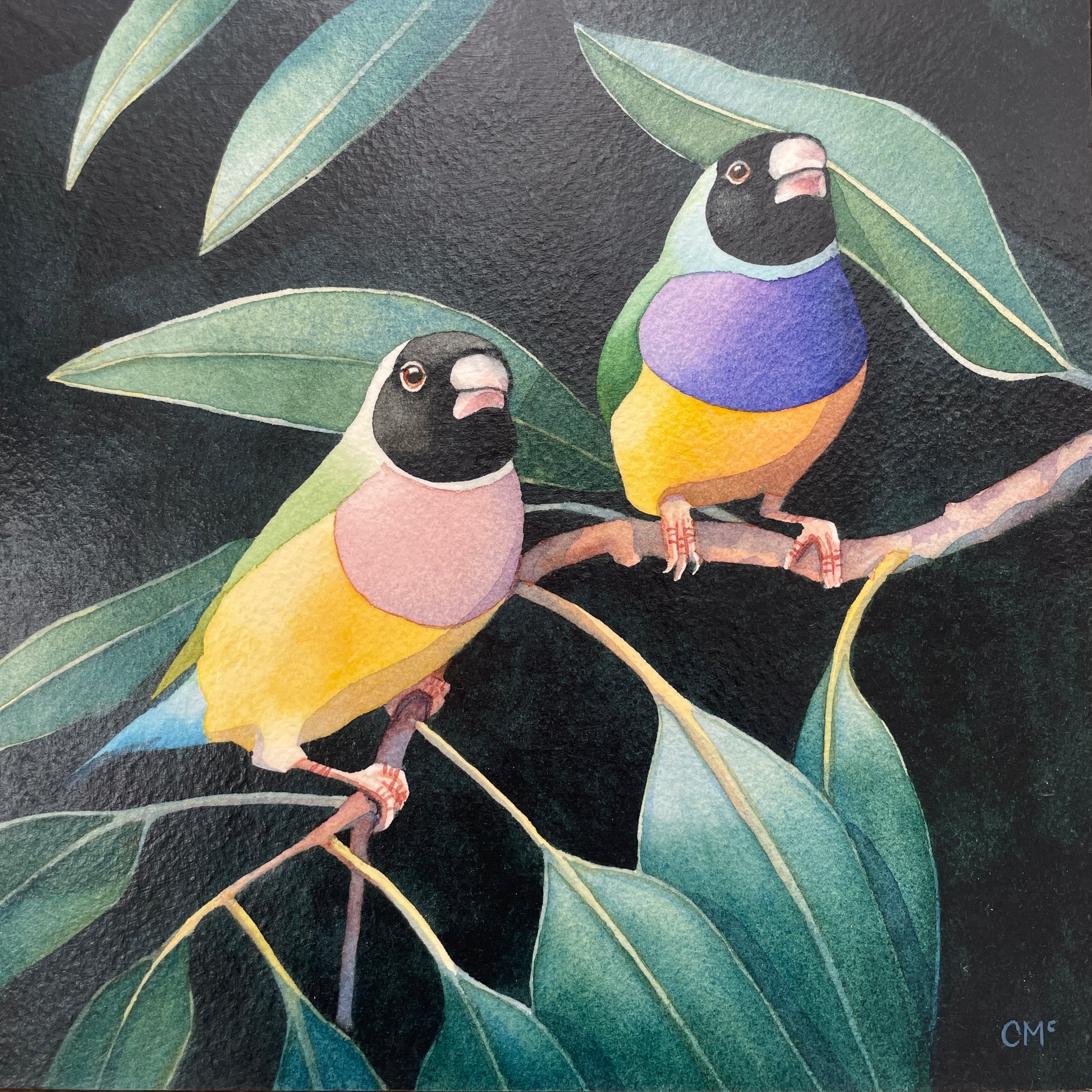 An original painting by Clare McCartney of two sweet little Gouldian Finches sitting in a gum tree.