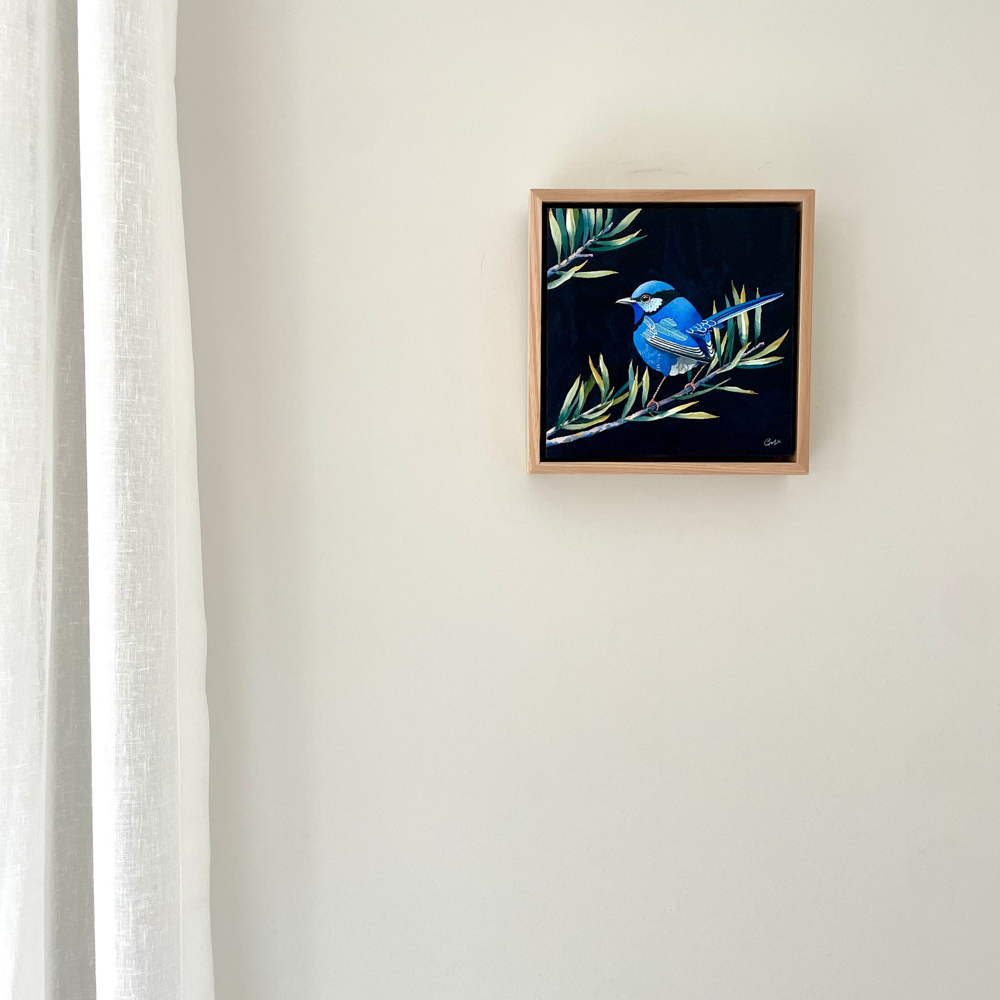 An original painting by Clare McCartney of a little Splendid fairy wren sitting amongst bottle brush branches.